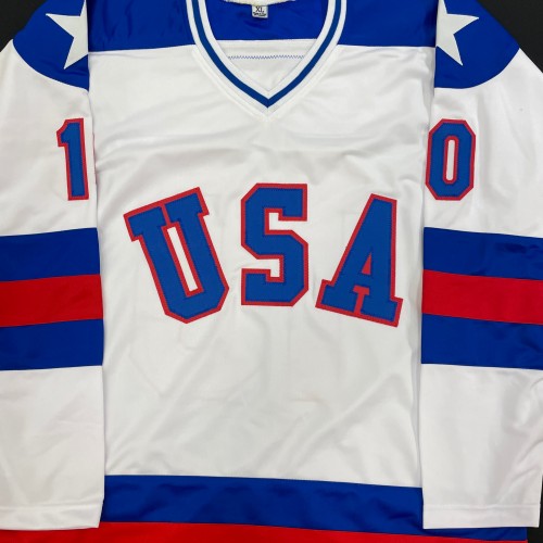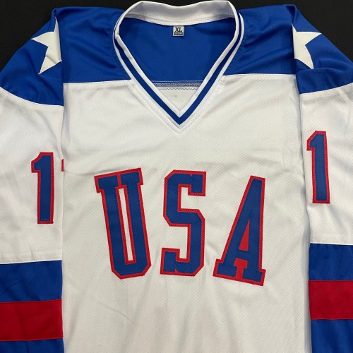 PRE-ORDER: Mark Johnson Autographed USA White Olympic-Style Jersey w/ 80 Gold Inscription
