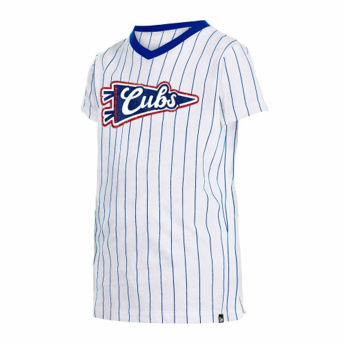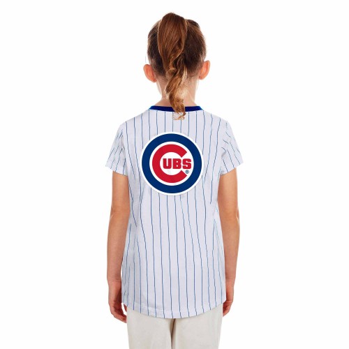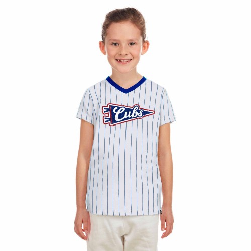 Brighten up your little Cubs fan’s closet with this Chicago Cubs Youth Girls Pennant Bullseye Pinstripe T-Shirt from New Era! This youth v-neck tee is made from a lightweight cotton, and has a tagless collar. It is white with royal blue pinstripes and a royal blue v-neck, and features a glitter-covered Cubs pennant graphic across the chest and a Cubs Bullseye logo on the back.
